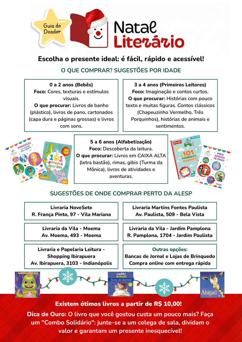 Para ajudar na escolha, preparamos o Guia do Doador (disponível no carrossel), com sugestões de títulos e locais de compra próximos à Alesp.